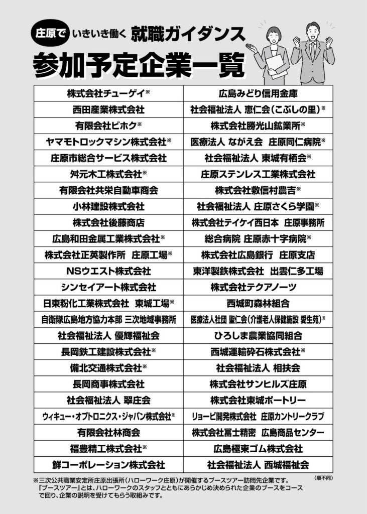 今回の「庄原でいきいき働く就職ガイダンス(合同企業面接会)」参加予定企業は以下のとおりです。